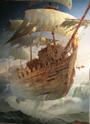 On summer nights, when falls that curious silence which is ominous of tempest, the storm ship is not only seen spinning across the mirror surface of the ocean, but the voices of the crew are heard as they chant at the braces and halyards in words devoid of meaning to the listeners